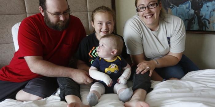 Give your baby daily opportunities for belly time, crawling, and cruising. Watch for potential blisters and bandage as needed for protection. When playing on the floor, use foam blocks for comfort and decreased friction, however, care should be taken to not make the surface too soft that it is difficult for your child to move. Teach family members and caregivers how to pick up your child appropriately so they don’t cause unnecessary harm to your child.